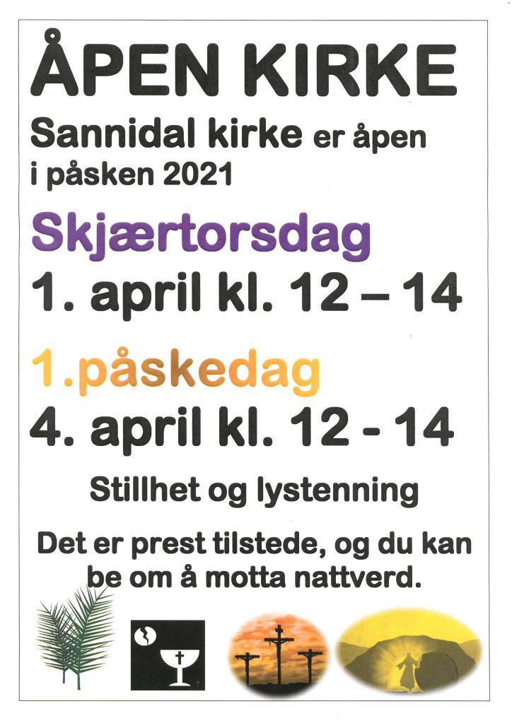 Men kirken vil være åpen Skjærtorsdag og 1. påskedag mellom kl. 12 og 14. Da er prest tilstede. I tillegg er kirken som alltid ellers åpen hver torsdag kveld mellom kl. 20.30 og 22.00.