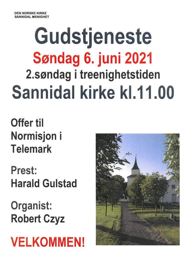 Det er gudstjeneste i Sannidal kirke søndag 6. juni 2021, kl. 11.00., med Harald Gulstad som prest, og Robert Czyz som organist. Offeret går til Normisjon i Telemark.