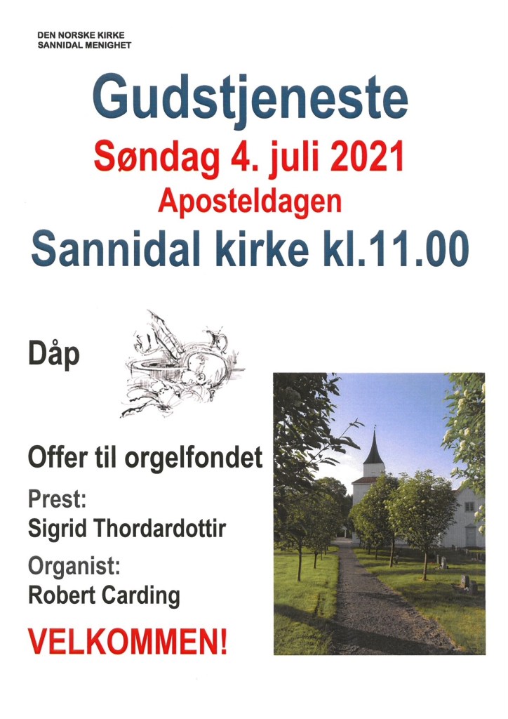 Velkommen til gudstjeneste i Sannidal kirke på Aposteldagen, søndag 4. juli kl. 11.00. Det er dåp av to små barn i gudstjenesten. Offeret er til orgelfondet i Sannidal kirke.
