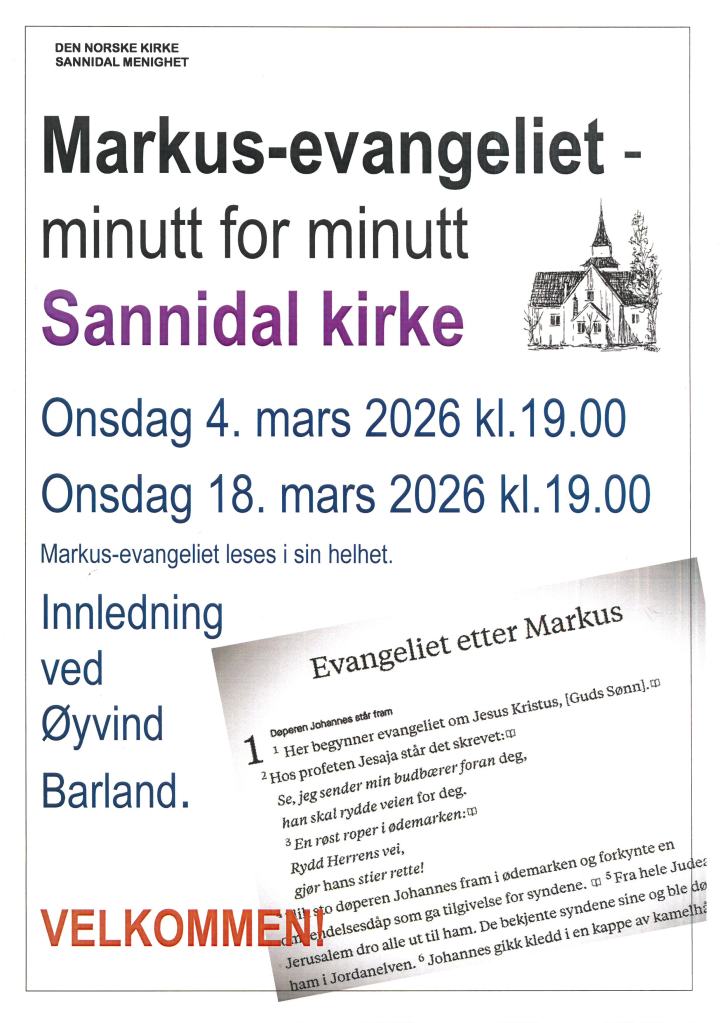 Onsdagene 4. og 18. mars 2026, fra kl. 19, leses Markus-evangeliet i sin helhet i Sannidal kirke.